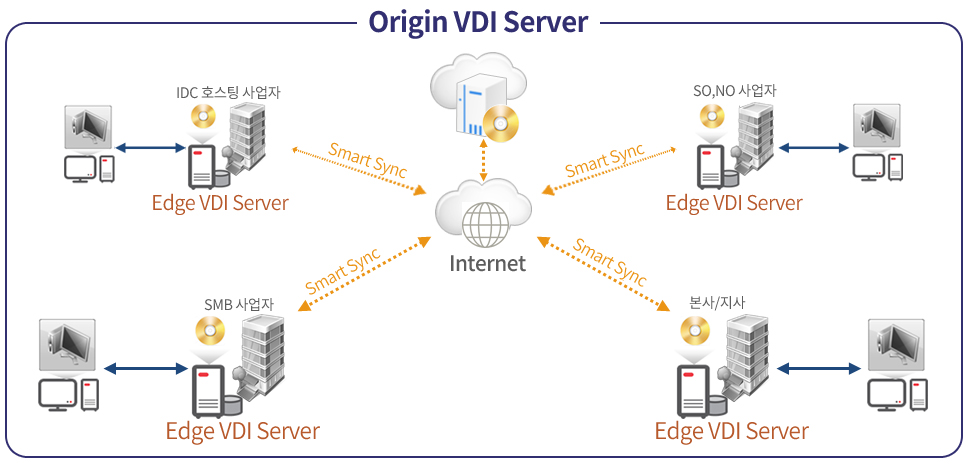 지리적 제약 없이 VDI 서비스를 안정적으로 이용 할 수 있도록, 사용자 네트워크 영역(Edge)에 VDI 서버를 설치하여 가상 데스크톱을 이용하는 서비스 입니다.